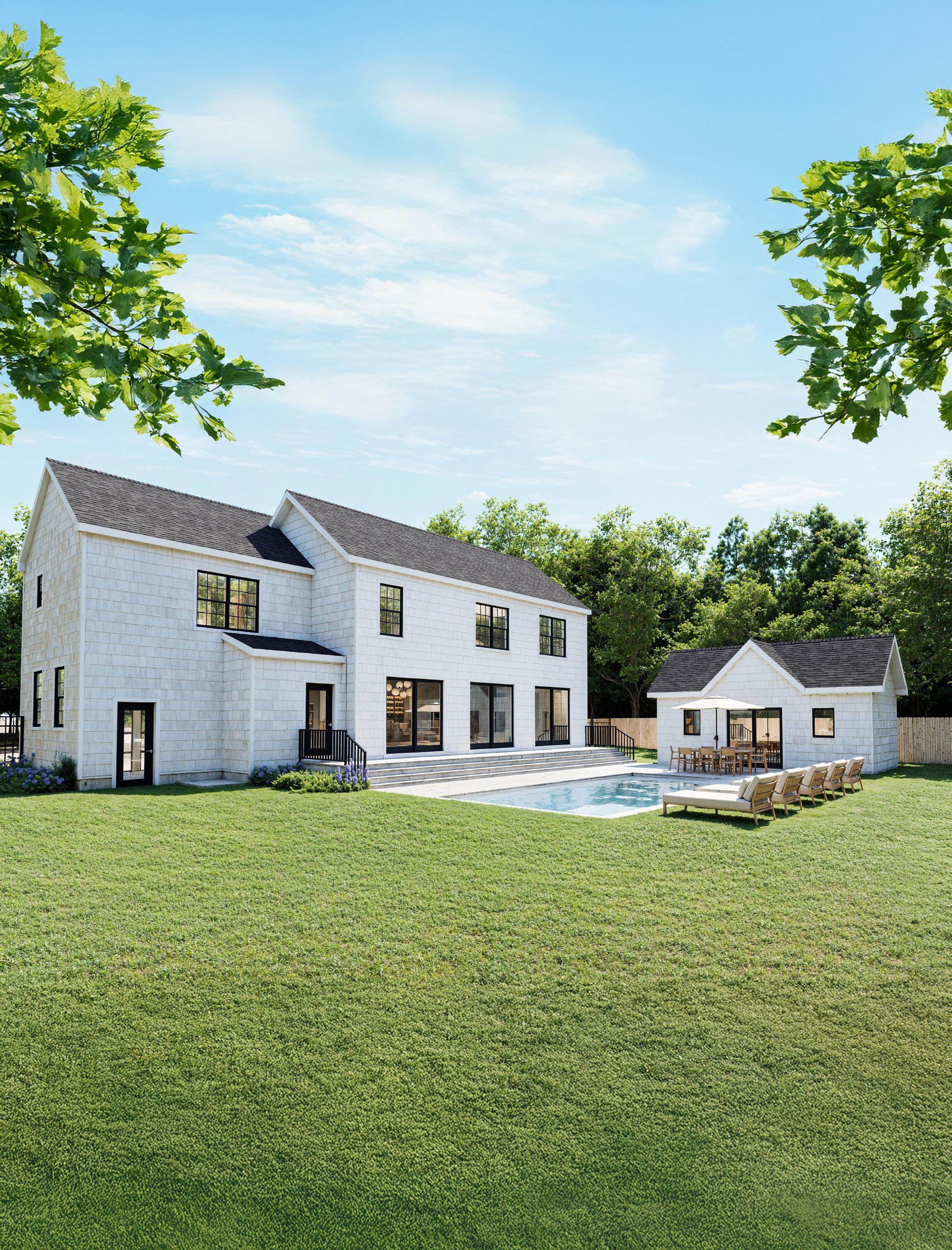 A stunning new construction offering luxurious living in the heart of Hampton Bays. Set on .41 acres, this impressive 5-bedroom, 3-bath home spans 4,546 +/- sq. ft. and blends sleek design with comfort and functionality. Inside, you’ll find hardwood floors throughout, a spacious living room, dining room, den/office, and a beautiful open kitchen equipped with modern appliances. The first and second-floor primary suites offer walk-in closets and ensuite baths, while the finished lower level features an additional bedroom and flexible living space - perfect for guests or a home gym. Entertain effortlessly in the beautifully landscaped backyard, where a 30’x16’ heated gunite pool, stone patio, and open porch create the ultimate outdoor oasis. Additional highlights include a loft, laundry room, central air, an attached 2-car garage, municipal water, and private septic. To be built in 2026, this exceptional home is a rare opportunity to own a brand-new residence close to beaches, restaurants, and all the best of the East End.