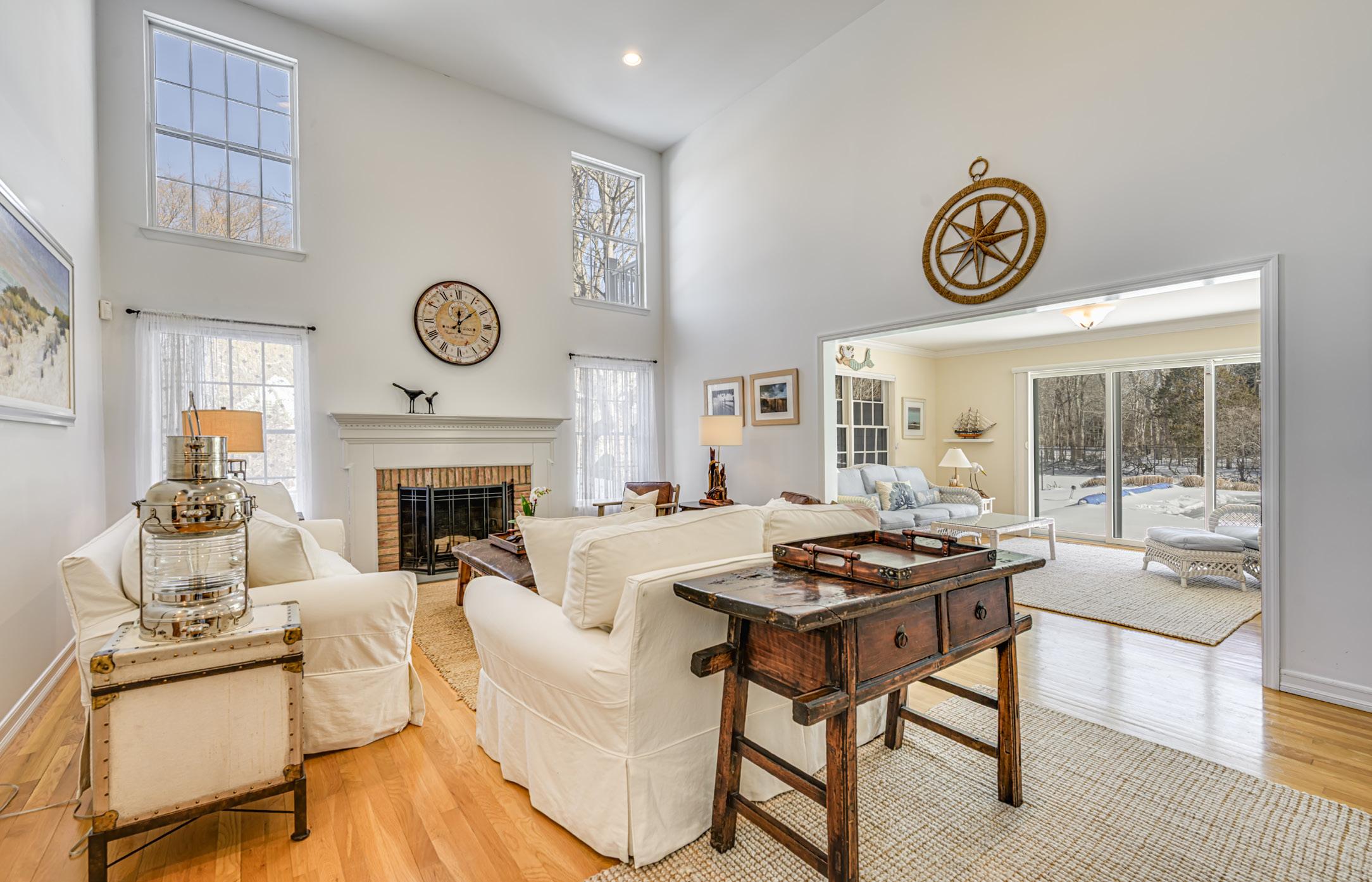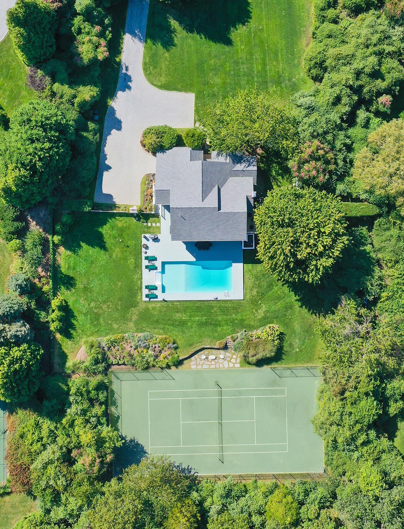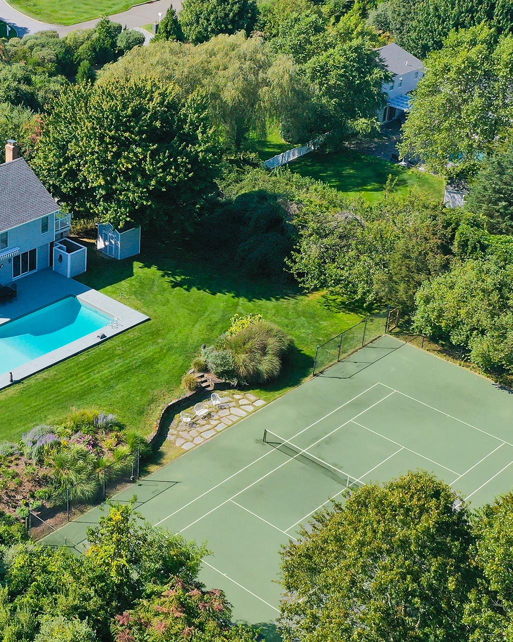 On 1.4 beautifully landscaped acres, set on a coveted court in Water Mill and surrounded by substantial homes and estates, this meticulously maintained 4-bedroom, 5-bath residence pairs stylish interiors with resort-style amenities, including a heated pool and private tennis. Peaceful and private with mature plantings and vibrant summer blooms, it’s a picture-perfect setting for effortless Hamptons living. Inside the 2,868 +/- SF home, the main living spaces are designed for easy entertaining and everyday comfort. The living room features soaring ceilings and a fireplace, complemented by a second family room, a formal dining room with glass doors to the backyard, and an inviting eat-in kitchen. A first-floor bedroom suite offers convenient flexibility, while the 2nd level hosts the primary suite plus 2 additional bedrooms that share a full bath. The home is ready for yearround luxury living, featuring an attached 1-car garage and a partially finished lower level offering an additional 1,435 +/- SF. The space includes a recreation area with a dry bar, a bonus area suitable for media or gym use, and a full bath. Outdoors, the sunny backyard is made for long, sun-drenched afternoons and starlit evenings: dine al fresco on the patio beneath a retractable awning, rinse off in the outdoor shower, and enjoy the heated pool set beside the tennis court. Lush gardens line the court, and the well-maintained grounds create a tranquil, bucolic backdrop. Ideally located just beyond the heart of Water Mill Village, this property is moments from world-class ocean beaches, renowned farmstands, and the best of Bridgehampton and Southampton Village-an exceptional blend of style, sophistication, and convenience that delivers the ultimate Hamptons lifestyle.