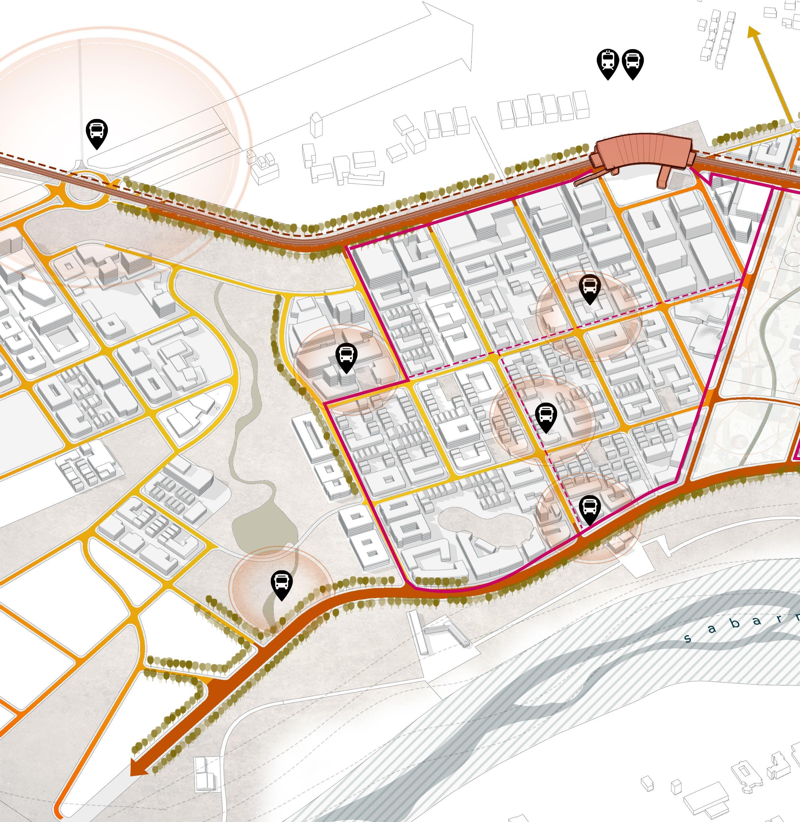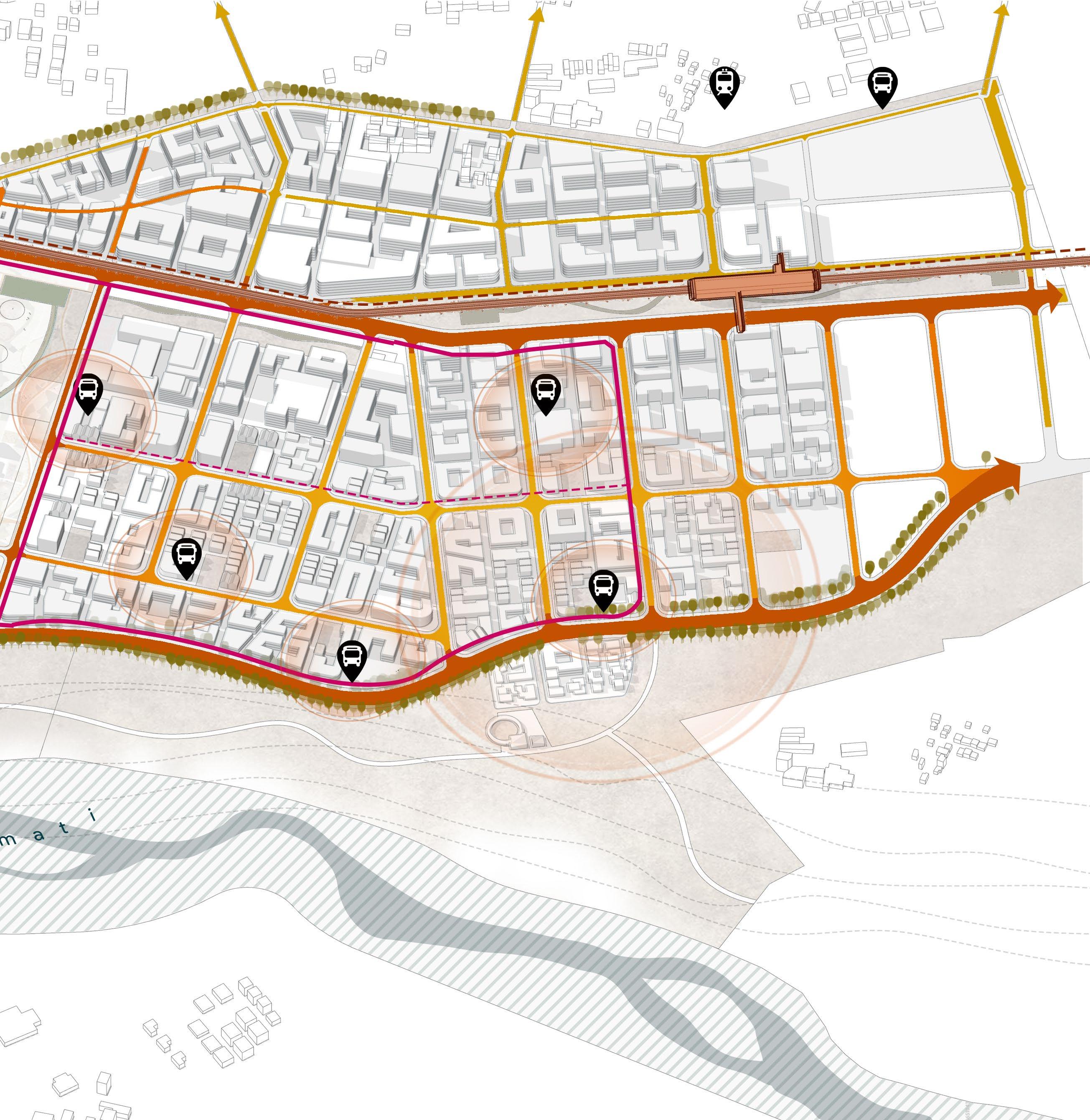 The connectivity of the transit, residential, and high-street/ commercial blocks in the master plan is crucial for its vision of a well-integrated, walkable, and accessible city. The transit systems, including buses and Public Light Buses (PLBs), are woven into the urban fabric to ensure seamless movement between these blocks while reducing reliance on private vehicles. Each block type is connected to transit systems differently, reflecting its functional role.
