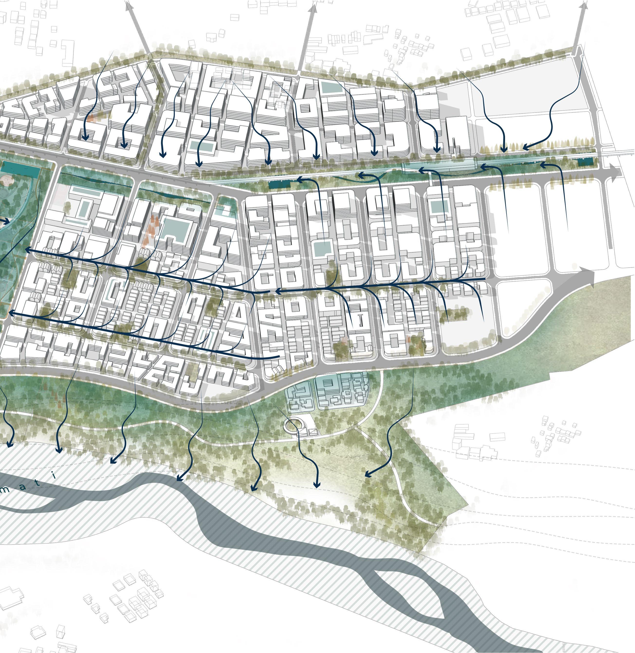 While this master plan challenges the conventional urban model by embedding green and blue infrastructure as the guiding framework for development, its success lies in this manifestation to reflect in the individual, resultant buildings. To delve deeper into the detailed urban design guidelines, two representative cases have been selected from the residential and commercial blocks, each highlighting distinct building typologies that embody the master plan’s vision.