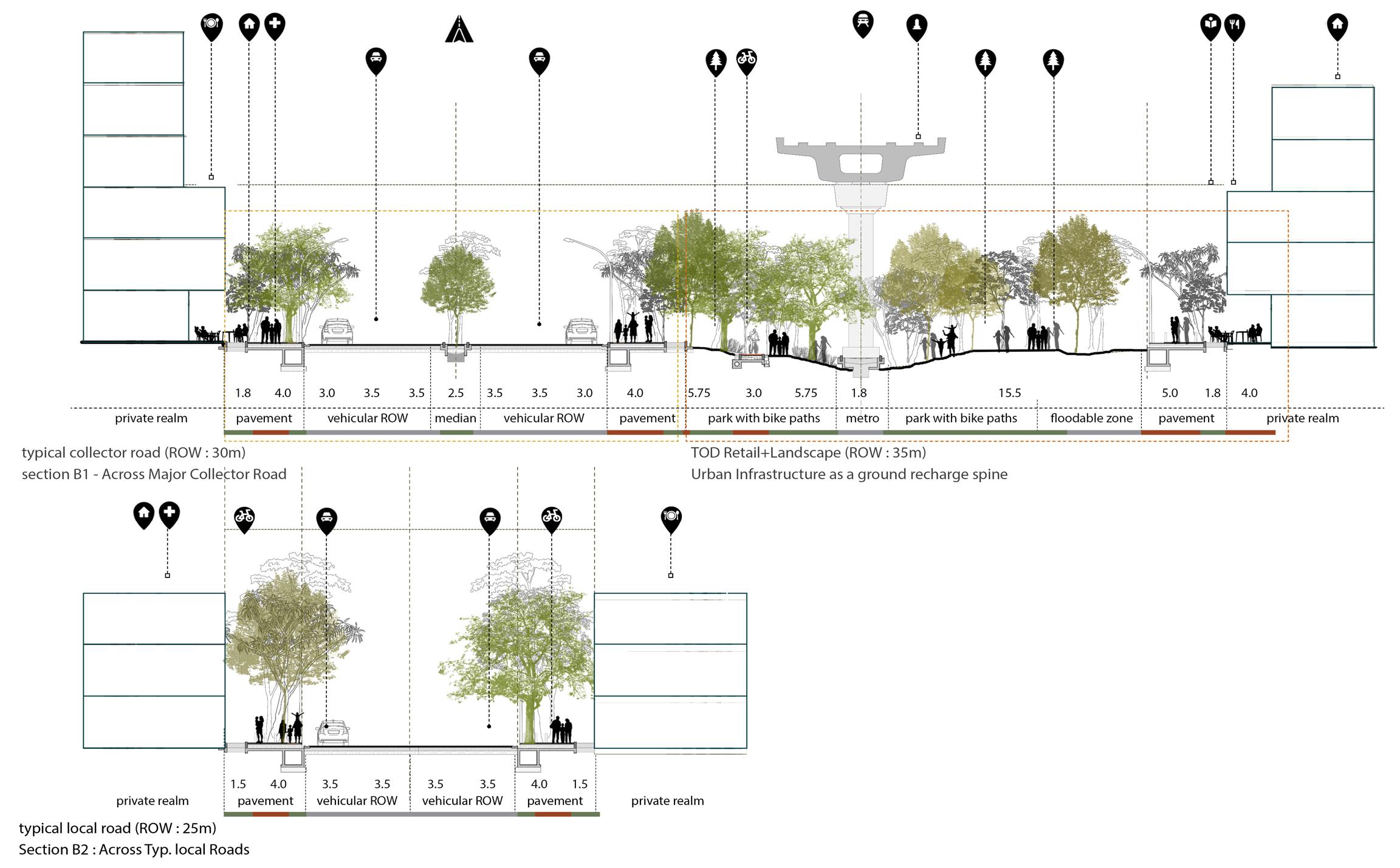 The GMRC corridor which runs parallel to one of the two major collectors as be re-imagined as a city level bioswales running across the master plan. The underside of the GMRC corridor is an park, and larger floodable shoulder. Activities from the ground floors of surrounding buildings are encourager to spill over the TOD retail zone along this corridor. This typology intends to capitalize on the ‘park’ like nature of the surrounding real estate. The parkways in ReWilding Koba are envisioned as multi-functional spaces that seamlessly integrate pedestrian and non-motorized transport (NMT) networks alongside vehic
