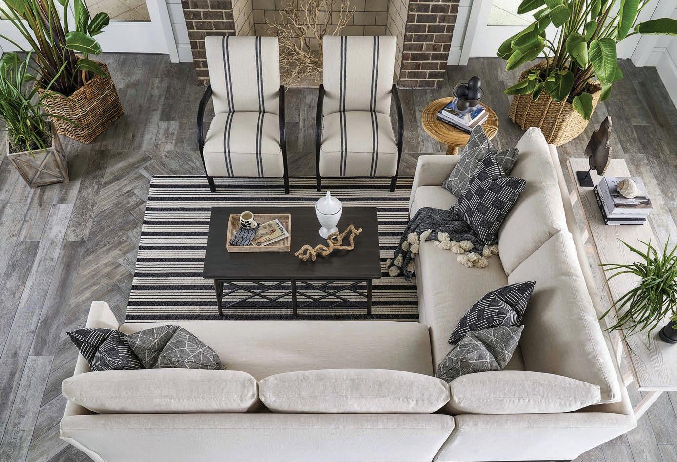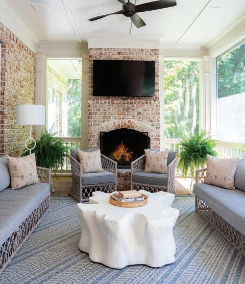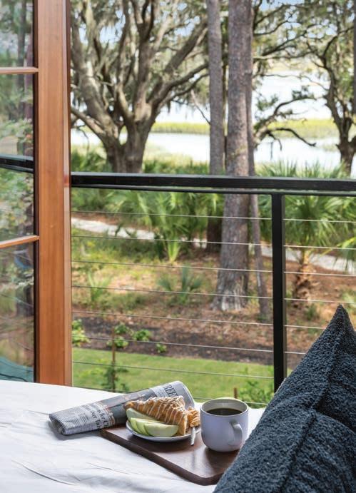 For a custom residence at the McAlister Point enclave within The Ford Field and River Club, Hansen Architects designed a porch o the primary bedroom that overlooks the marshes of the Ogeechee River. The woven lounge chairs and ottomans create a relaxing space to read or snack, while the hanging bed o ers the perfect place for a nap.