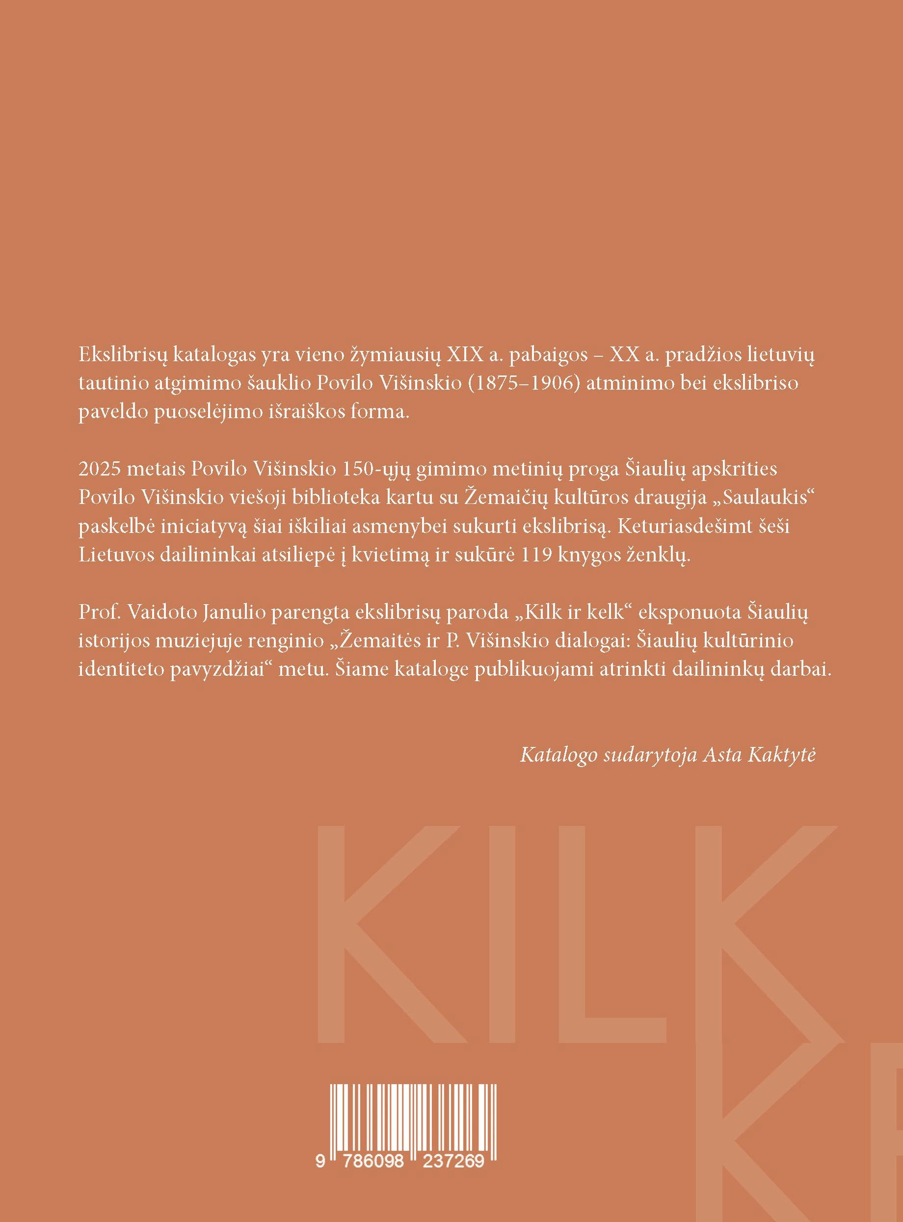 „Kilk ir kelk“: ekslibrisų katalogas / tekstus parengė Bronius Maskuliūnas, Juozas Pabrėža, Vaidotas Janulis; sudarė Asta Kaktytė. – Šiauliai: Šiaulių apskrities Povilo Višinskio viešoji biblioteka, Žemaičių kultūros draugija „Saulaukis“, 2025. – 56 p.: iliustr.