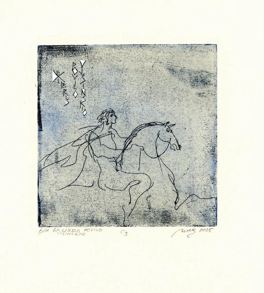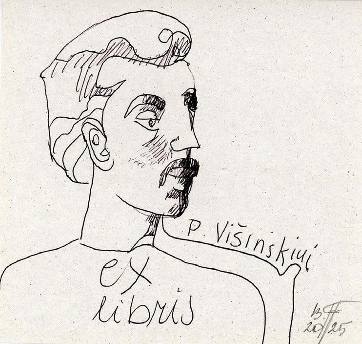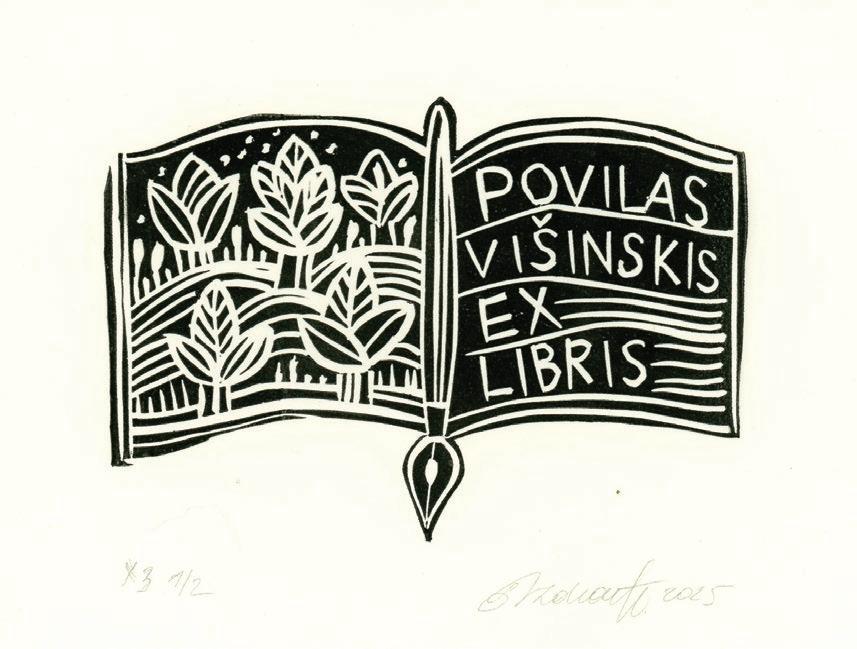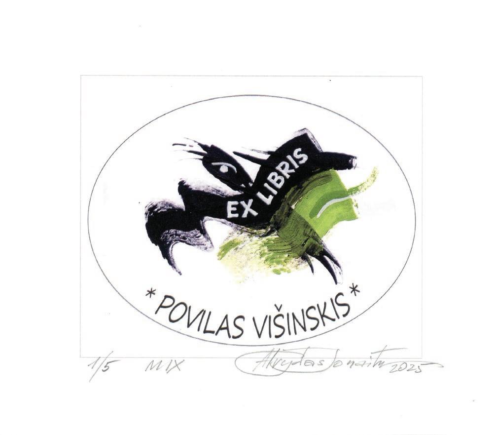 Mindaugo Petrulio ekslibrisuose Povilo Višinskio mintys sklando elegantiškos kaligrafijos erdvėse, sukeldamos emocijų bangas, kurios nuskuba prie Rasos