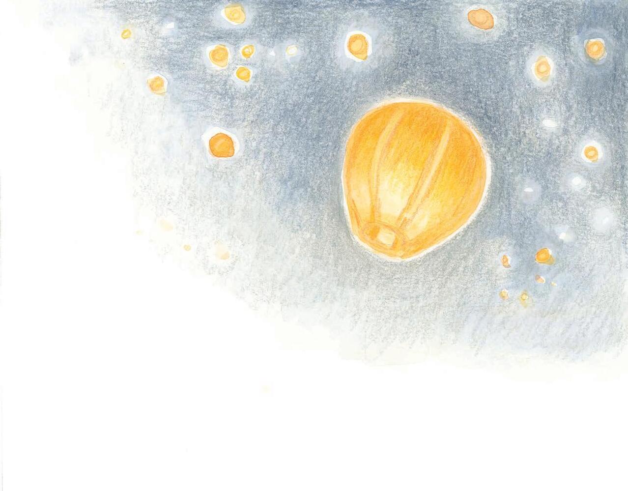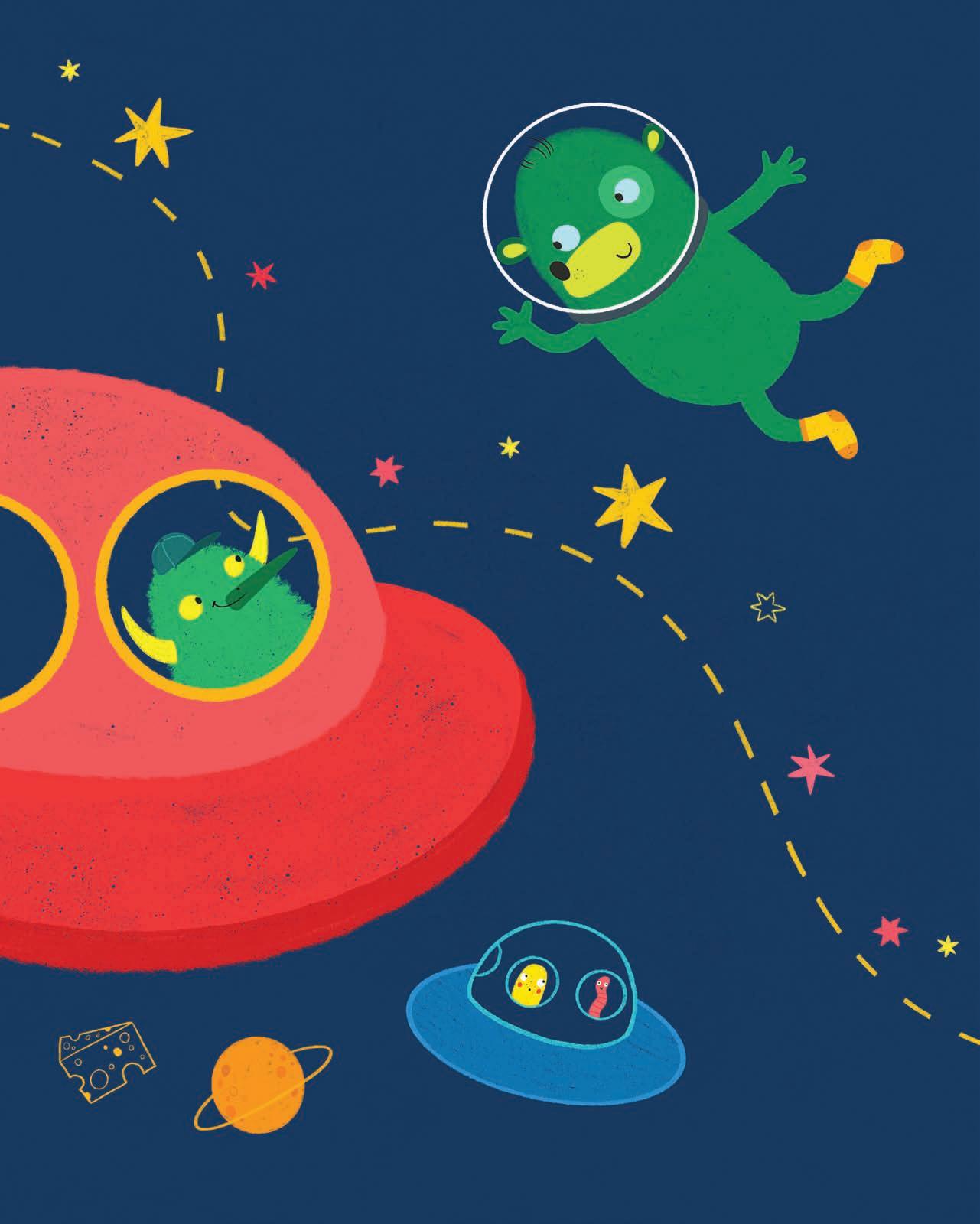 We race past thousand suns and planets. Some stars are small and white, others are larger and yellow. The largest are red. We’re getting closer to my planet! The rocket descends silently. A parachute opens, and the rocket sways like a dandelion seed before landing on a lake.