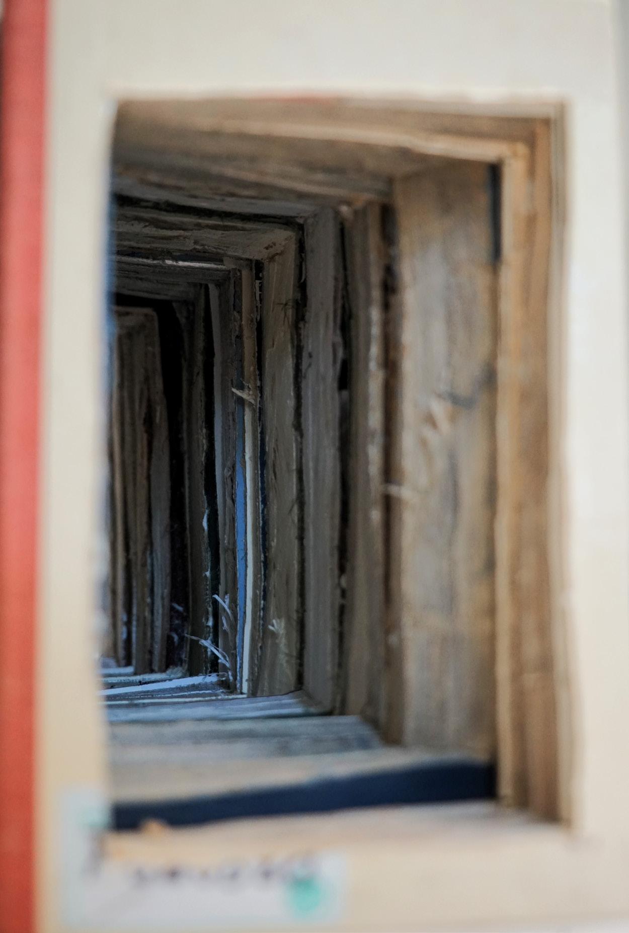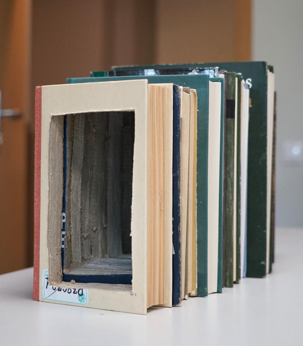 When I started this project, I had no specific idea, I just knew that I would try to use enough out-of-use books to give some “relief” to the library. Maybe it’s also the desire to finally clean up, or at least tidy up... that keeps haunting me. All the ideas for the pieces came from the process of observing the environment, feeling the materials and trying out the guillotine for the first time in the library’s bookbinding space. I knew I wouldn’t be using my usual tools. Maybe it’s a bit risky, but you never know... The only limitation, which I gratefully accepted, is that the works will be exhibited in other spaces, so they must be easily transportable.