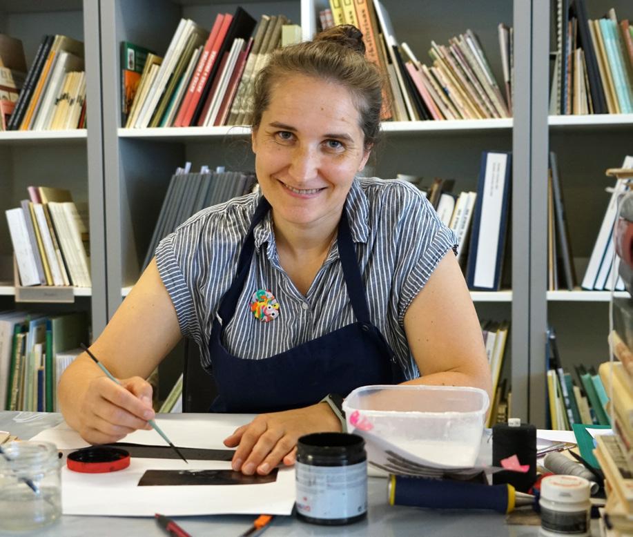 “Lighting the fire” in this installation symbolizes the process of change – it is the transformation of dozens of book blocks into a single surface.