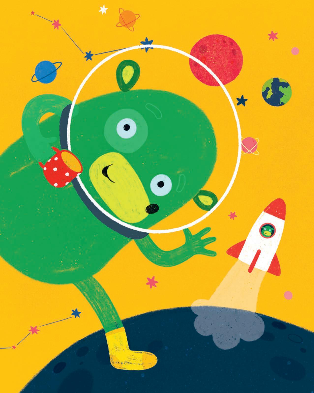 apvali raketa, o joje – plunksnuotas astronautas ilgu žaliu snapu.