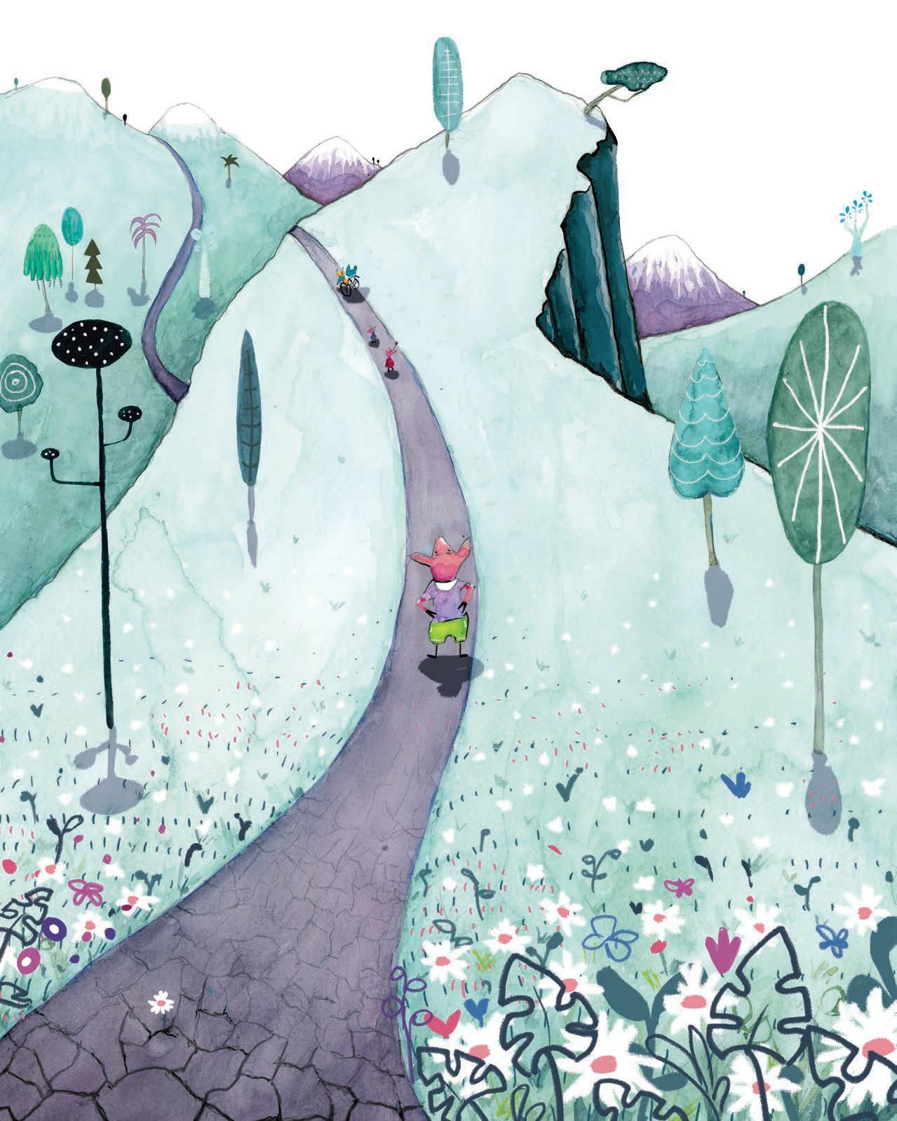 Iš pradžių kelias buvo lygus ir gerai pramintas, bet netrukus priešais juos iškilo pirmasis kalnelis. Meškinas ryžtingai stūmėsi į priekį.