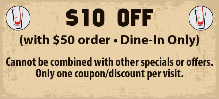 This offer is NOT valid with any other discounts, coupons, specials or on holidays. One coupon per person/table per visit.