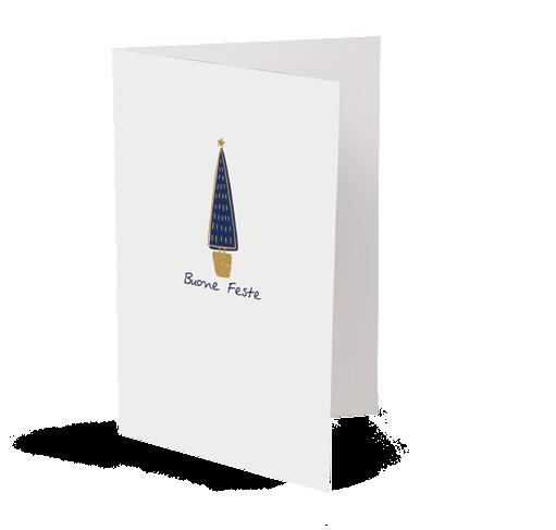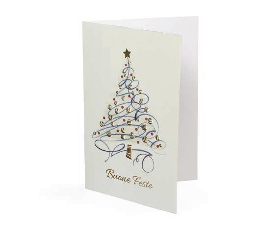 Biglietto in cartoncino FSC patinato bianco con stampa a 4 colori e decori in oro. Il piccolo alberello blu e oro è un particolare che viene stampato in rilievo.