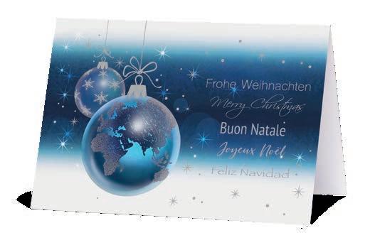 Biglietto in cartoncino patinato FSC, con stampa a colori, verniciatura lucida e decori in argento per un augurio dallo stile molto internazionale.