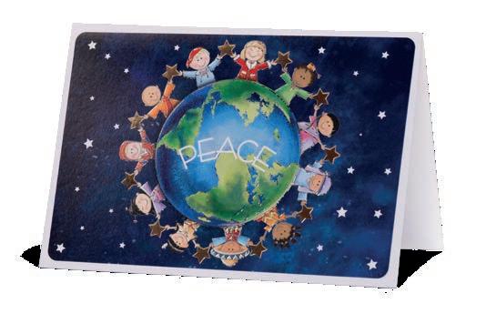 FSC patinato bianco, con stampa a 4 colori e decori in oro a caldo. Il disegno è messaggio di pace per tutti, da parte dei bambini di tutto il mondo.