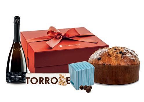 La confezione alimentare dolce contiene un panettone, un astuccio di boules di cioccolato, un torrone friabile e una bottiglia di spumante extra dry biologico. I prodotti sono posti all’interno di un’elegante scatola rossa personalizzabile.