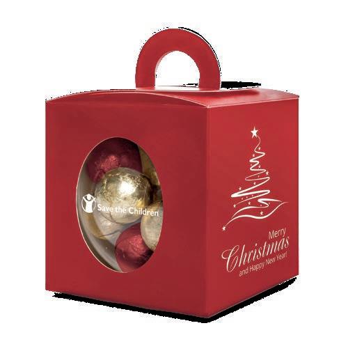 La pallina in plexiglass trasparente contiene 195gr di boules di cioccolato con crema di nocciola. Viene confezionata in un elegante astuccio rosso soft touch.