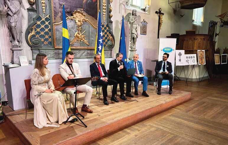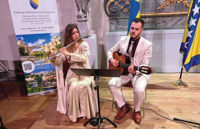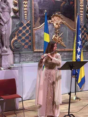 Mlada gošća iz domovine, Tuzlanka Kanita Kahrimanović, na flauti je odsvirala državne himne Bosne i Hercegovine i Švedske i svojom izvedbom zaista oduševila prisutne diplomatske predstavnike. Na ovoj svečanosti bili su predstavnici 44 države sa svih šest kontinenata, kao i članovi švedskog parlamenta, predstavnici institucija Kraljevine Švedske te akademske i kulturne zajednice. Mi, prisutni Bosanci i Hercegovci, u tom trenutku smo bili izuzetno ponosni na ovu mladu umjetnicu.Veliku pažnju privukla je i neobična, vrhunska izložba pod nazivom „Signa et Insignia Bosnae“, autora Adisa Eliasa Fejzića i Danisa Lana Fejzića, realizovana u saradnji s arheologinjom i historičarkom umjetnosti Editom Vučić. Do tada nisam poznavao rad Adisa Fejzića, pa smo razgovarali o njegovom