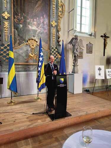 U međuvremenu su počeli pristizati pozvani gosti. Srdačan susret imao sam i s dugogodišnjom poznanicom, ženom koja je mnogo učinila za našu državu – velikom humanisticom i borcem za ljudska prava, Christinom Doctare. Iako u poodmaklim godinama, ona i dalje ima fantastičnu memoriju i mentalnu snagu te redovno dolazi na naše važne skupove.Tačno prema programu, u 14 sati prisutnima se na tečnom engleskom jeziku obratio Njegova ekselencija, gospodin Bojan Šošić. Prigodnim riječima govorio je o značaju ovog važnog datuma u novijoj historiji Bosne i Hercegovine. Drugi govornik bio je predstavnik Ministarstva vanjskih poslova Kraljevine Švedske, Carl Michael Gräns, zamjenik šefa Odjela za Evropu i Sjevernu Ameriku. I on je istakao važnost ovog datuma, veoma dobre odnose između naših i švedskih vlasti, te uspješnu misiju naše dijaspore u Švedskoj.