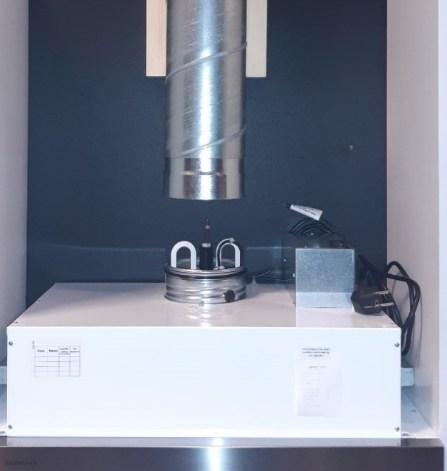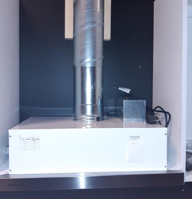 Kuvan liesikupu on varustettu mV-125 tehostusventtiilillä.(#91360). Tehostusventtiili asennetaan alakautta, poista ensin rasvasuodatin ja kierrä venttiili kiinni lähtökaulukseen. Tarkemmat asennusohjeet löydät käyttöohjeista s.15.