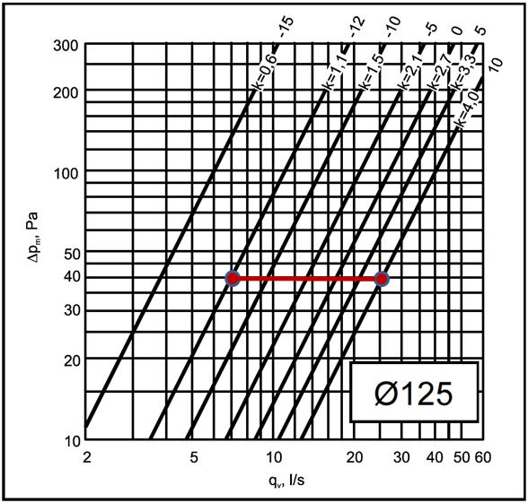 Venttiili on tehdasasetuksena säädetty alla olevan kuvan mukaisesti. Venttiilin yli vaikuttavalla paine-eroarvolla 40 Pascal saavutetaan seuraavat ilmanvirtausarvot: