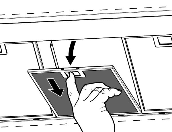 Irrota rasvasuodattimet painamalla suodattimen lukitussalpaa kahvansuuntaisesti taaksepäin ja vedä suodatin pois alakautta.