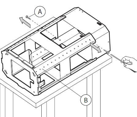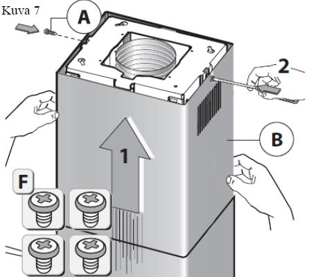 • Ota liesituulettimen runko paketista ja laita se työpöydälle ja erota rungon ylä– ja alaosa toisistaan irrottamalla kaksi ruuvia A (Kuva 2).
