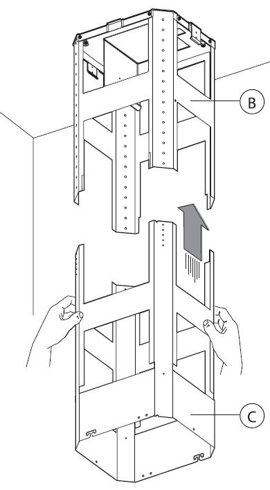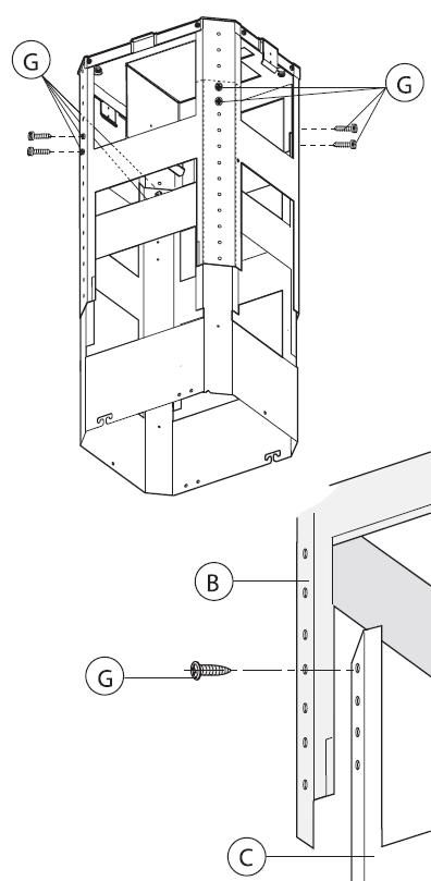• Ota teleskooppirungon alaosa C ja liitä se rungon yläosaan B (kuva 5). Säädä rungon korkeus oikeaksi mukana tulevilla kahdeksalla ruuvilla G (kuva 6), kuvien 14 ja 15 mukaisilla mittaohjeilla.