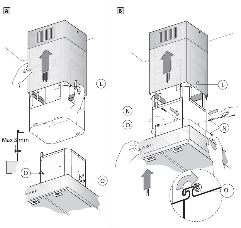 • Löysää ruuveja O max. 3mm (kuva 8). Kiinnitä liesituuletin teleskooppirunkoon, varmista, että liesituuletin asettuu teleskooppirungon alaosan koloihin (O). Kiristä ruuvit N ja O.