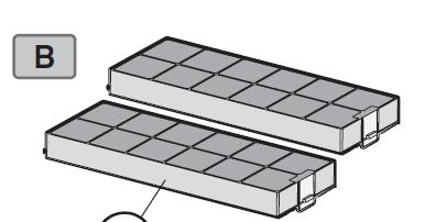 Kuvassa Long Life aktiivihiilisuodattimen asentaminen. Poista aktiivihiiliyksikkö tukikehikosta ennen aktiivihiiliyksikön pesua ja regenerointia uunissa (tukikehikko ei kestä uunin lämpötiloja).