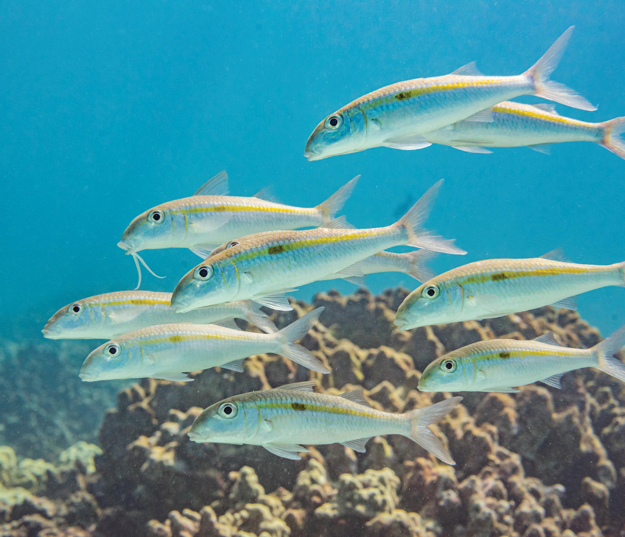 Several goatfish species are highly esteemed in ancient Hawaiian culture; they were used as offerings to the gods, prized at feasts, atoned for sins and celebrated in song. All goatfish species are popular as food—eaten raw, broiled, cooked in ti leaves or salted for a couple of days then cooked. Snorkelers are sure to spot them in groups around vibrant island reefs. If you can catch your own, you are in for a delicious treat.