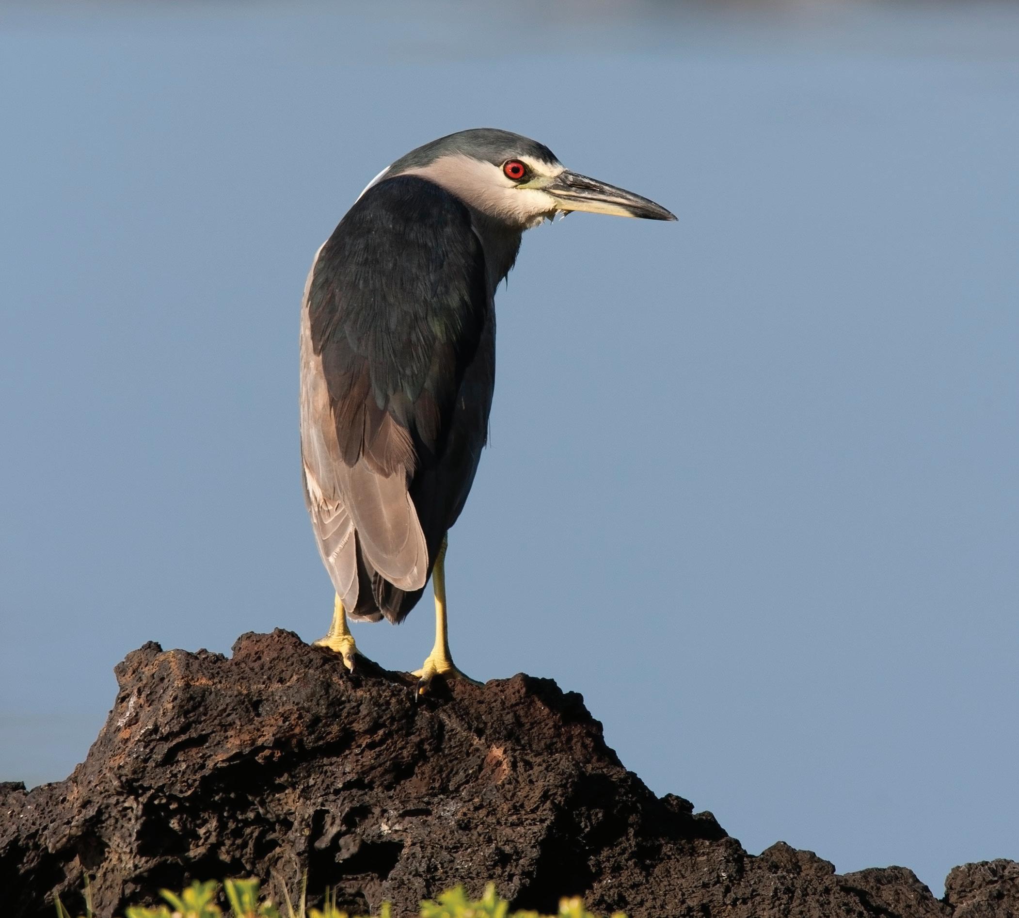 Short legs and an even shorter neck give the ‘auku‘u, or black-crowned night heron, a laid-back but regal look. However, this demeanor is misleading, for there is nothing relaxed about the way these water-loving species attack their prey. When hunting, the heron waits patiently motionless at water’s edge until an unsuspecting fish, frog, mouse, insect or small bird comes by and then snatches the prey quickly with its long sharp beak. Despite its name, the night heron also likes to hunt early morning as well as dusk, and spends its time in aquatic habitats from mountain streams to ponds and the shoreline. Since much of its wetland habitat has been lost, ‘auku‘u are often seen hunting in golf course ponds, fish farms and even resort ponds awaiting the arrival of its next meal.