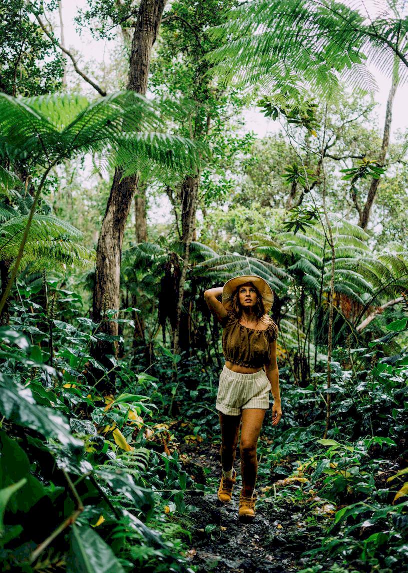 The trailhead is accessible by taking Highway 190 to Kaloko Drive, between the 34- and 35-mile markers. The drive up Kaloko is scenic, with palm trees, monstera, anthurium, rainbow eucalyptus and bamboo all lining the steep road. After about four miles, Makahi Street will be on the left. Park near the trailhead sign at the end of the road. Stop at the trailhead sign to learn more about the cultural and ecological significance of Makāula-‘O‘oma and familiarize yourself with the trails. To prevent the spread of invasive plant seeds and diseases that threaten the forest’s fragile ecosystem, clean off your shoes at the brush station before and after hitting the trail. Let the sound of chirping crickets and the cool of the forest wash over you as you choose between Upper Jurassic and Lower Jurassic, two aptly named, unpaved trails. On both, you may encounter loose rocks, roots, wet leaves and mud that encourage you to slow down and enjoy the tranquility and greenery.