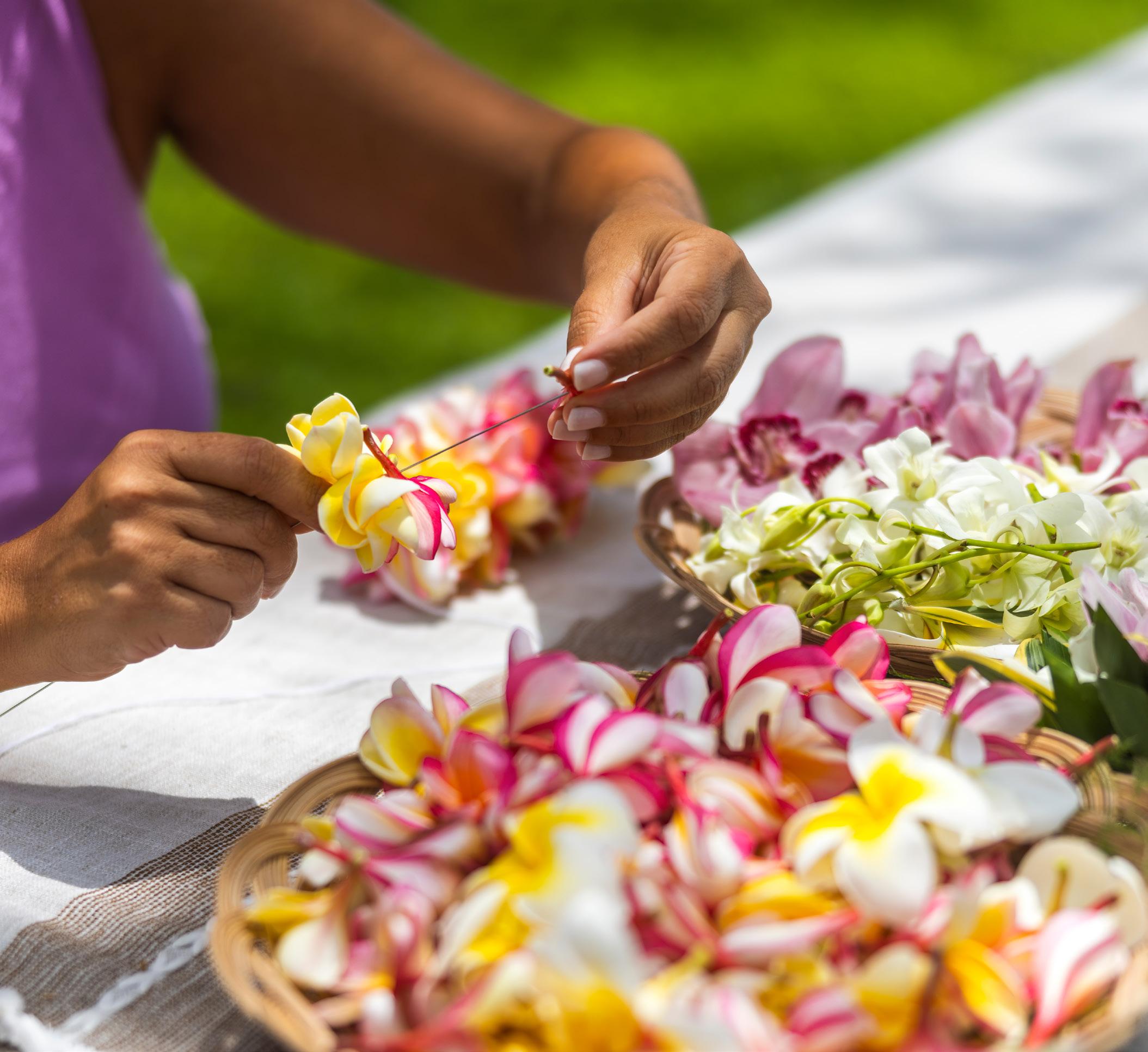 Plumeria, or melia, is a popular flower for lei for its sweet fragrance, beauty, color variation and abundance. White plumeria are most often seen though they can be pink or red and include yellow and orange hues. Also called frangipani, they are a favorite in perfumes and bathing products. With their elliptical, pointy petals, they are as beautiful as they are pungent with velvety texture that makes them feel sensuous to the touch. It takes approximately 50 blossoms for a single, 40-inch lei. The plumeria lei will last for one day. To maintain the freshness of the lei, sprinkle water lightly, wrap in a damp paper towel and keep cool.