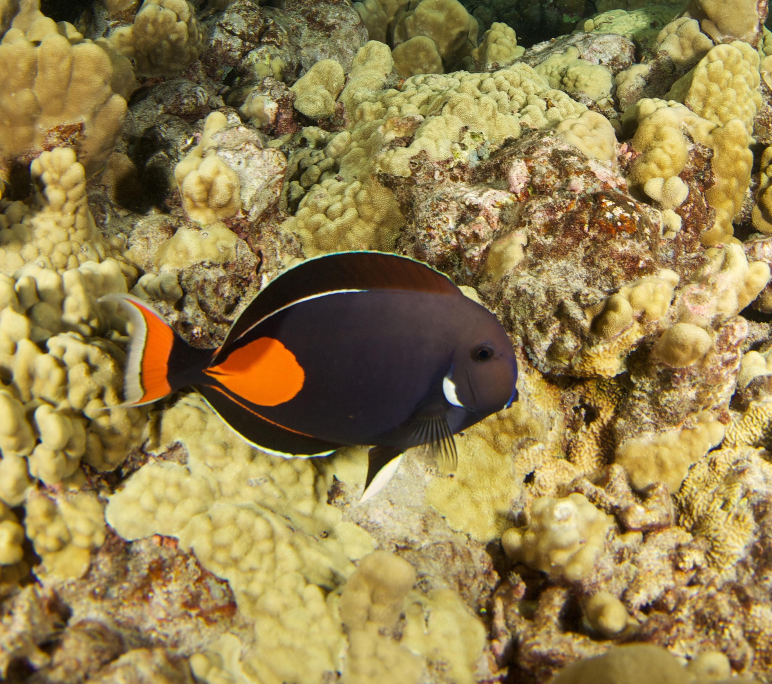Beautiful and vibrant, the Achilles tang (Acanthurus achilles) adds a splash of color wherever it swims. This tropical marine surgeonfish is native to the Pacific Ocean and is black in color with vivid orange, white and blue streaks along its fins and tail. Reaching around 10 inches in length in adulthood, the Achilles tang enjoys feeding on benthic algae, but will eat brine shrimp when in captivity. Achilles tangs can be nervous swimmers with a tendency to “pace” back and forth and enjoy unobstructed swimming spaces. The Achilles tang does best in turbulent waters with lots of surface movement, which translates to a higher saturation of oxygen in the water. The sturgeonfish is known as pāku‘iku‘i in Hawaiian and is sure to brighten anyone lucky enough to see it in the wild.