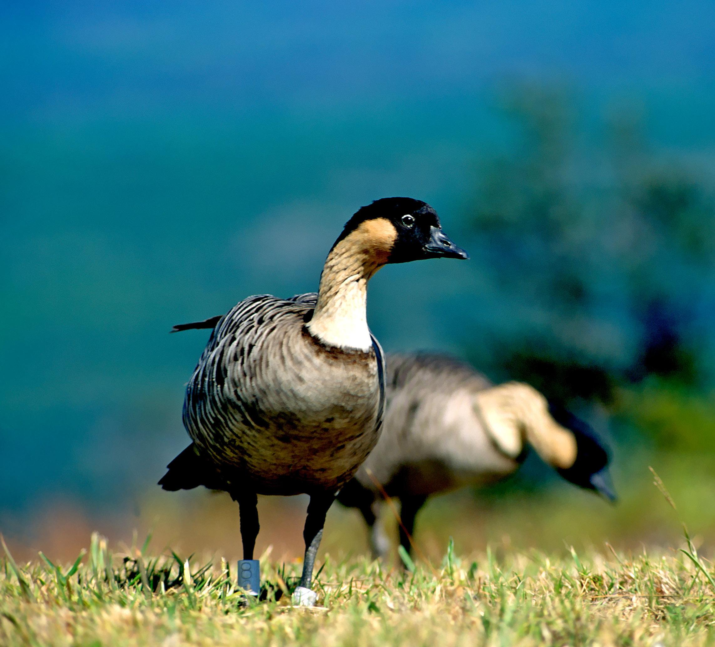 Nēnē, the Hawaiian Goose, is the rarest goose in the world and is endemic to the Hawaiian Islands. It evolved from the Canada goose, and most likely arrived around 500,000 years ago. The once almost extinct bird gets its Hawaiian name for the soft honking calls it makes. The nēnē has strong toes with reduced webbings as an adaptation to the rocky lava flows on which it breeds and lives. The nēnē is unique from other waterfowls in that they mate on land. They breed between August and April, the longest breeding season among other goose. The female builds her nests in the concealment of bushy pockets of vegetation and lays one to five eggs. The female incubates her eggs about 30 days while the male is on the lookout for predators such as the mongoose.
