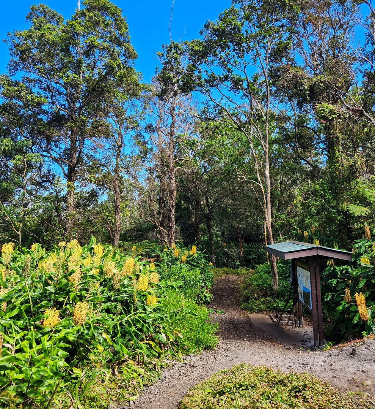 As you ascend through the reserve, you’ll cross two natural bridges leading you deeper into ancient forests and past kahili ginger. Although invasive in Hawai‘i, the ginger’s golden flowers scent the trail with their enticing fragrance when in bloom. After 0.45 miles, you’ll reach the Crosstown Trail. You can turn around here, continue another 0.25 miles to Hallway, or traverse all 0.8 miles of Crosstown and turn around once you reach Pig Skull Trail. Whatever distance you choose, you’ll gain a deeper understanding of the importance of this enchanting cloud forest. The forest was a vital source of resources for the traditional Hawaiian way of life, including wood and plants for practical, medicinal and spiritual purposes.