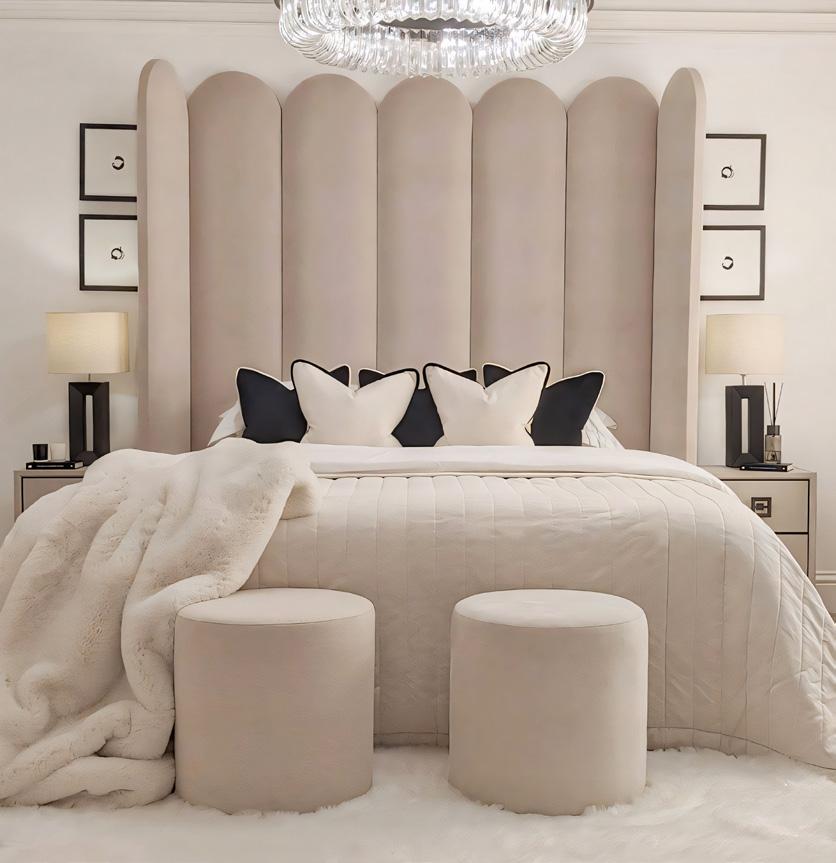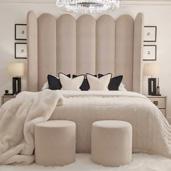 The Florence Mink Curved Fluted Headboard lends sculptural elegance to the bedroom. Defined by a softly arched silhouette and a halfmoon fluted finish, its hinged end flutes can be gently angled to create an intimate, winged effect. Upholstered in plush mink velvet with an easy-clean finish, it balances tactile luxury with practicality. Beautifully designed and simple to install with a French cleat wall fixing, this statement headboard brings depth, warmth and a quietly confident sense of sophistication to a sleeping space.