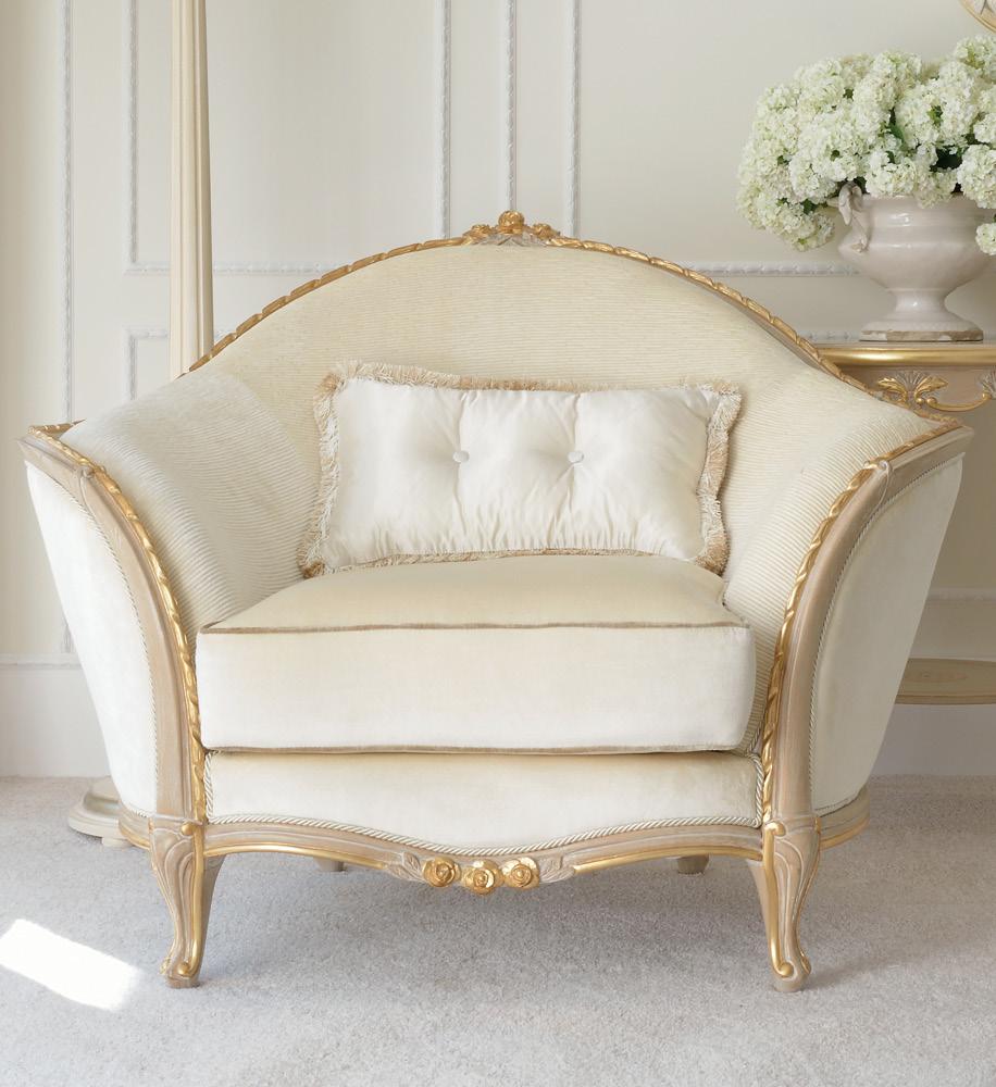 The Cream and Gold Reproduction Louis Armchair brings a note of classical elegance to contemporary interiors. Its gracefully curved silhouette is accentuated by a hand-painted finish and delicate gold-leaf detailing, while rich ivory upholstery lends a refined softness. Crafted to exceptional standards, the armchair can be customised with alternative fabrics and finishes, with a choice of feather or memory foam seat cushioning. Each piece is fully handcrafted to order, celebrating meticulous craftsmanship and timeless, classic design.