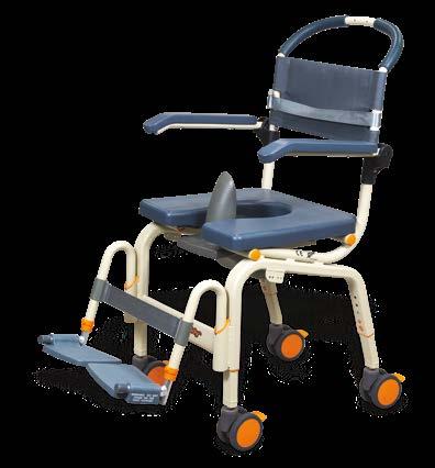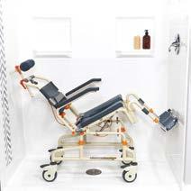 The Showerbuddy SB3T rolling shower chair is designed for a curb-less/ accessible or roll-in shower stall. The SB3T rolls over most toilets for use as a commode and offers a tilt position that releases pressure for the user and improves comfort. The chair includes a standard front opening cushion, headrest, swing away and removable footrests, flip back and removable armrests, 4” lockable casters, removable commode, seat belt, and height adjustability. ShowerBuddy (SB3T) is a caregiver-assisted product; it is not