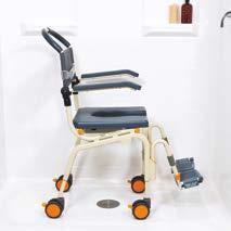 The Roll-In Buddy Solo (SB6W) shower chair is designed for a curb-less/accessible or roll-in shower stall. The SB6W can roll over most toilets to be used as a commode. It is a self-propelled shower chair and is designed for independent use. The SB6W includes two 24” drive wheels to allow the user safe and easy maneuvering throughout their home and restroom areas. The chair comes standard with a front opening cushion, swing away and removable footrests, a clip-on calf strap, flip back armrests (not lockable), a commode bucket with lid, pee guard, chest belt, and is
