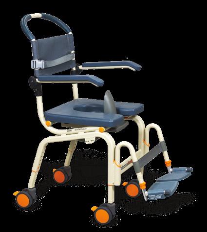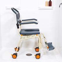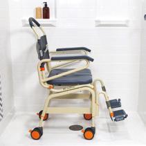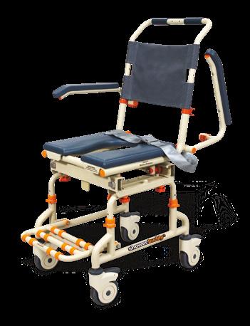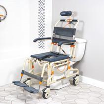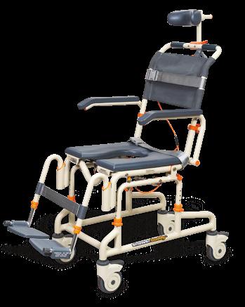 The Showerbuddy SB3T rolling shower chair is designed for a curb-less/ accessible or roll-in shower stall. The SB3T rolls over most toilets for use as a commode and offers a tilt position that releases pressure for the user and improves comfort. The chair includes a standard front opening cushion, headrest, swing away and removable footrests, flip back and removable armrests, 4” lockable casters, removable commode, seat belt, and height adjustability. ShowerBuddy (SB3T) is a caregiver-assisted product; it is not