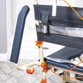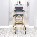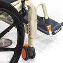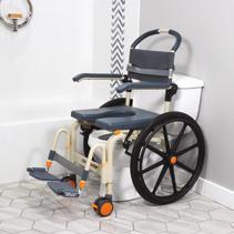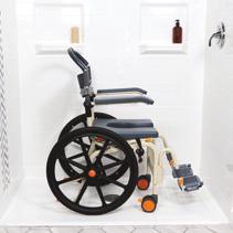 The Roll-In Buddy Solo (SB6W) shower chair is designed for a curb-less/accessible or roll-in shower stall. The SB6W can roll over most toilets to be used as a commode. It is a self-propelled shower chair and is designed for independent use. The SB6W includes two 24” drive wheels to allow the user safe and easy maneuvering throughout their home and restroom areas. The chair comes standard with a front opening cushion, swing away and removable footrests, a clip-on calf strap, flip back armrests (not lockable), a commode bucket with lid, pee guard, chest belt, and is