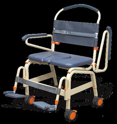 The ShowerBuddy Bariatric Shower Chair (SB6C-22) (SB6C-26) are designed for curb-less/accessible or roll-in showers. These chairs are intended for bariatric use and can accommodate patients up to 440 lbs. The seat width ranges between 22” and 26". Both chairs can roll over most toilets to be used as a commode. The chairs come standard with a front opening cushion, swing away and removable footrests, a clip-on calf strap, lockable flip-back armrests, a commode bucket with lid, pee guard, chest belt, and is height adjustable. These ShowerBuddy Bariatric Shower Chairs are caregiver-assisted products; they are not intended for independent use.