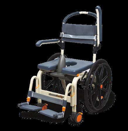 The Roll-In Buddy Solo (SB6W) shower chair is designed for a curb-less/accessible or roll-in shower stall. The SB6W can roll over most toilets to be used as a commode. It is a self-propelled shower chair and is designed for independent use. The SB6W includes two 24” drive wheels to allow the user safe and easy maneuvering throughout their home and restroom areas. The chair comes standard with a front opening cushion, swing away and removable footrests, a clip-on calf strap, flip back armrests (not lockable), a commode bucket with lid, pee guard, chest belt, and is