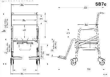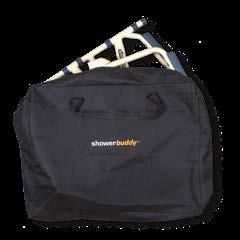 The ShowerBuddy Eco Traveler (SB7E) is designed for a curb-less/ accessible or roll-in shower stall. The SB7E can roll over most toilets to be used as a commode. It is lightweight yet sturdy, built with a strong aluminum frame, and intended for use during travel. It can fold away neatly into a travel bag (sold separately) or into a closet for storage purposes. Despite its small size, the SB7e still enjoys the premium 4" locking casters, commode bucket with a lid, as well as swing-away height adjustable footrests. The ShowerBuddy Eco Traveler (SB7E) is a caregiver-assisted product; it is not intended for