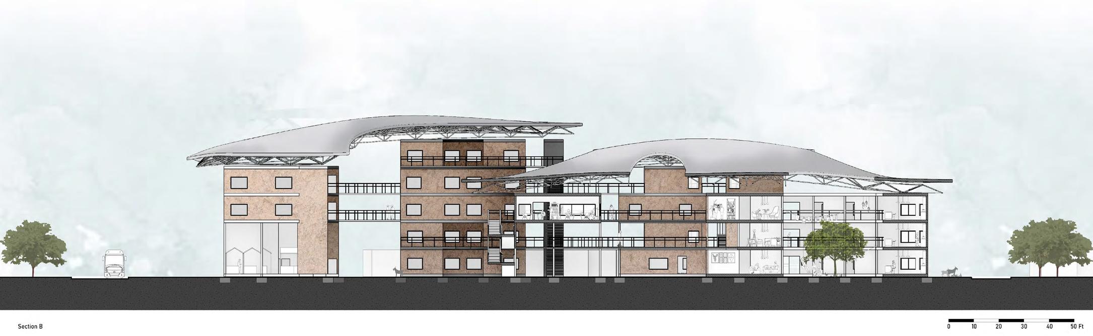 The structural system is made of earthblocks with reinforced concrete slabs. Most openings and public spaces face the North while a system of louvres or screens shades the building facing the Southwest. A system of platforms and balconies for open-air circulation connects the buildings on the upper floors and functions as overhangs for shading. The free form roof, supported by a steel space-truss system, unifies the buildings into one cohesive complex and overhangs for sun protection. It is detached to the ceiling of the last floor as a cooling strategy to promote natural air ventilation and circulation.