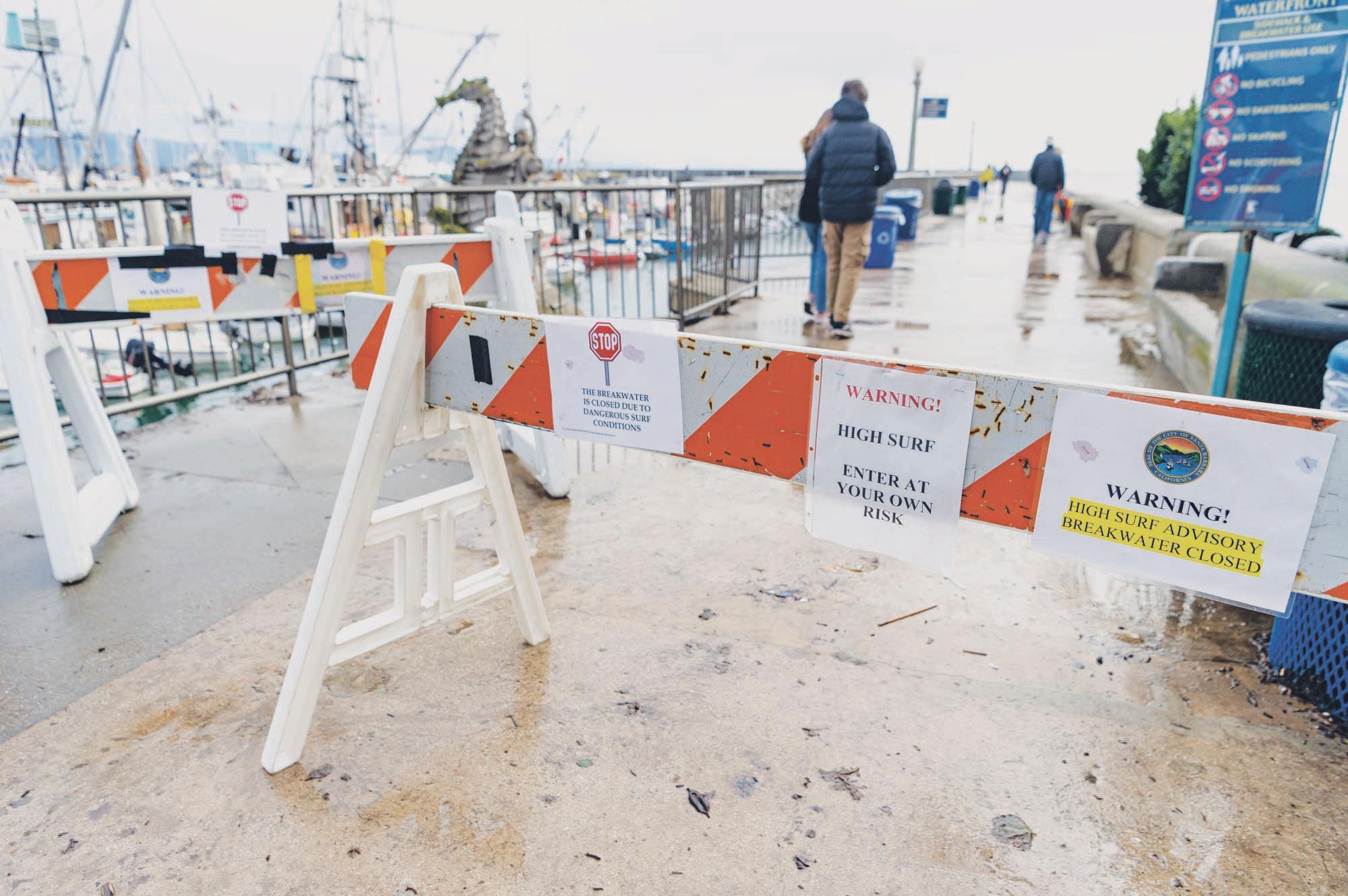 Passersby bypass barricades erected to deter visitors walking onto the breakwater at the Santa Barbara Harbor during inclement weather and high surf on Sunday.