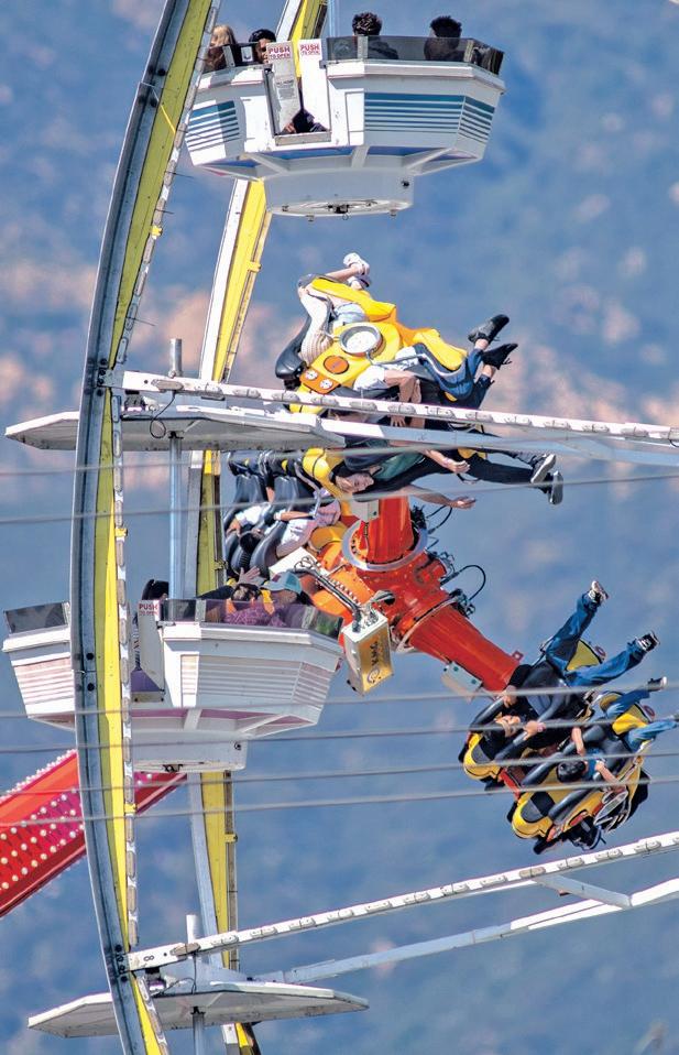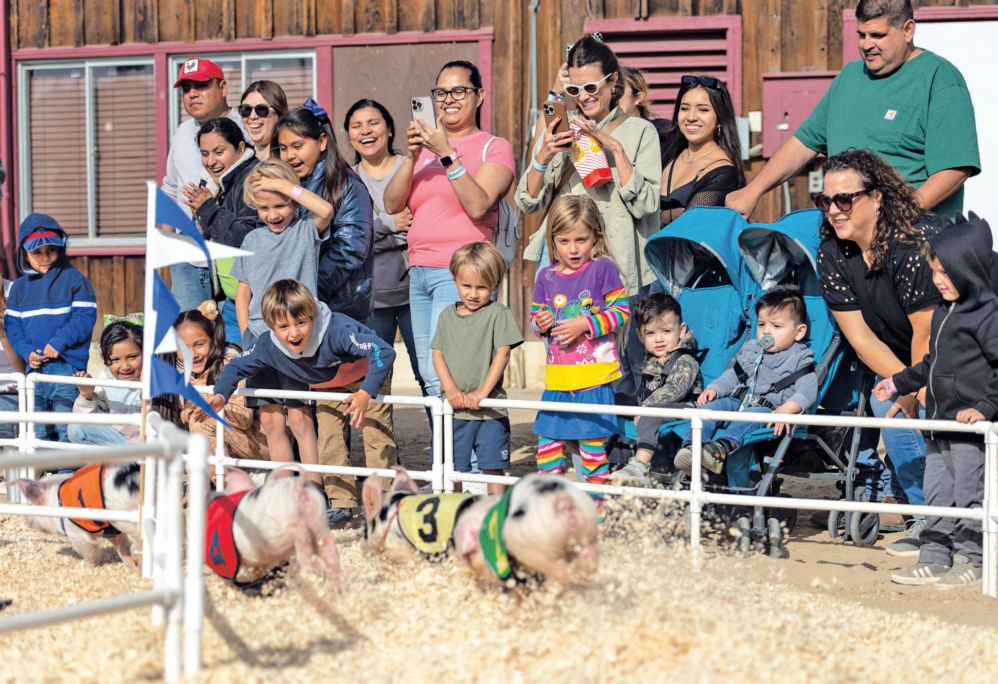 variousmethods of ascent to rise above the Earl Warren Showgrounds in Santa Barbara during the Santa Barbara Fair & Expo. At left, spectators cheer on the competitors of the All-Alaskan Racing Pigs event on Thursday.