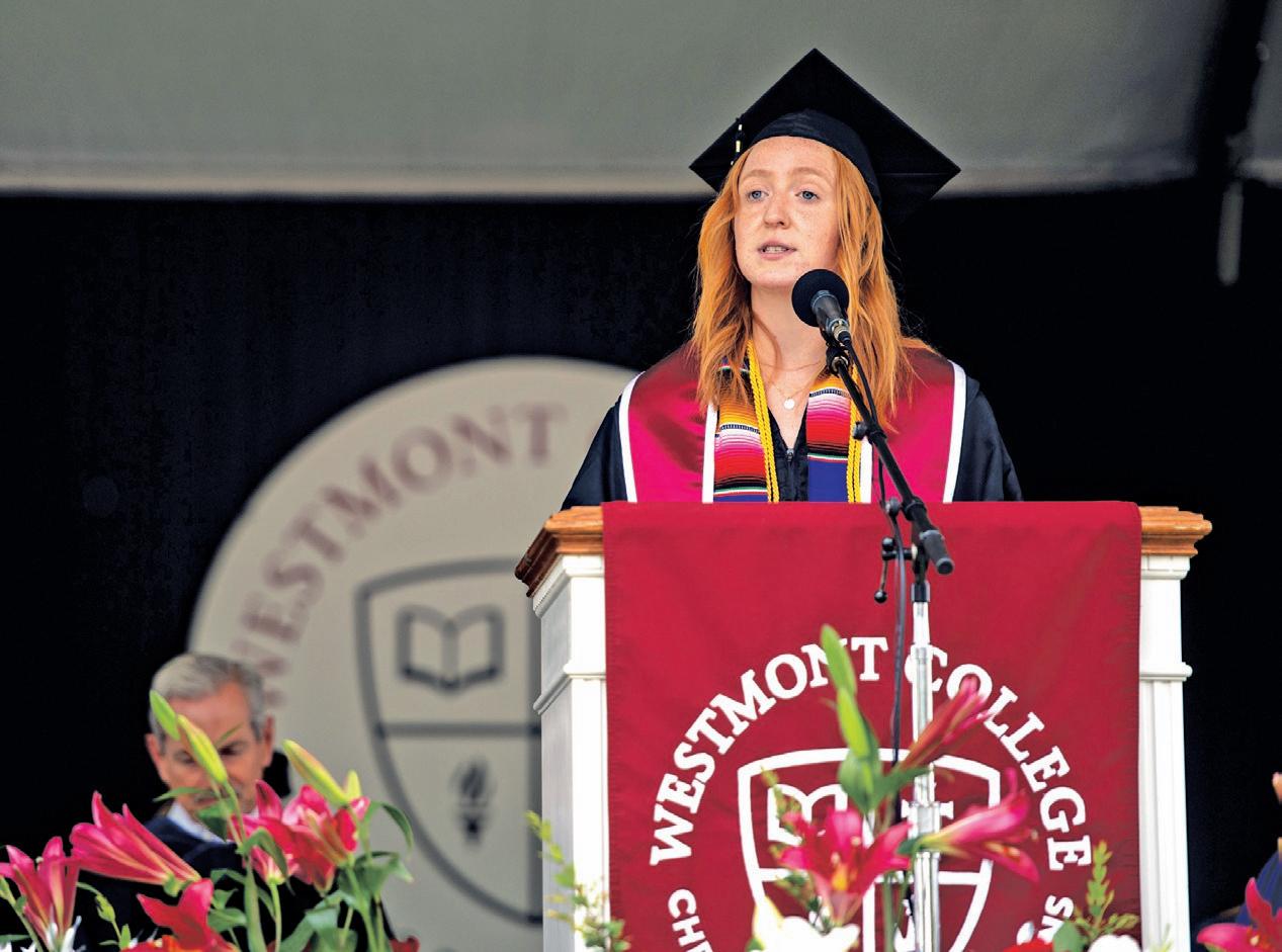 Above, Westmont College graduate Mercy Milliken speaks at the Class of 2023 commencement ceremony. At right, Jonathan Walker, co-founder and CTO of local software company Appfolio,