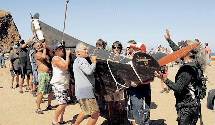 The “Elye’wun,” the first of three tomols built in 1997, is carried toward the sea.