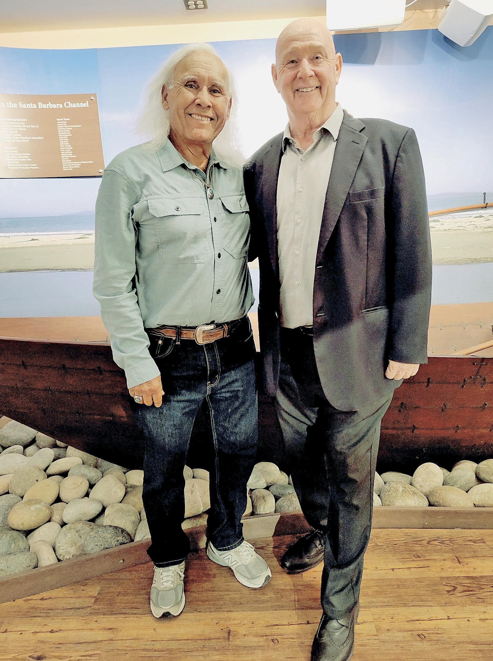 Chumash Elder Alan Salazar, left, is shown with Santa Barbara Maritime Museum Executive Director Greg Gorga. Mr. Salazar announced a partnership between the Ventura Chumash and Patagonia to build tomols during a talk at the museum on Nov. 17.